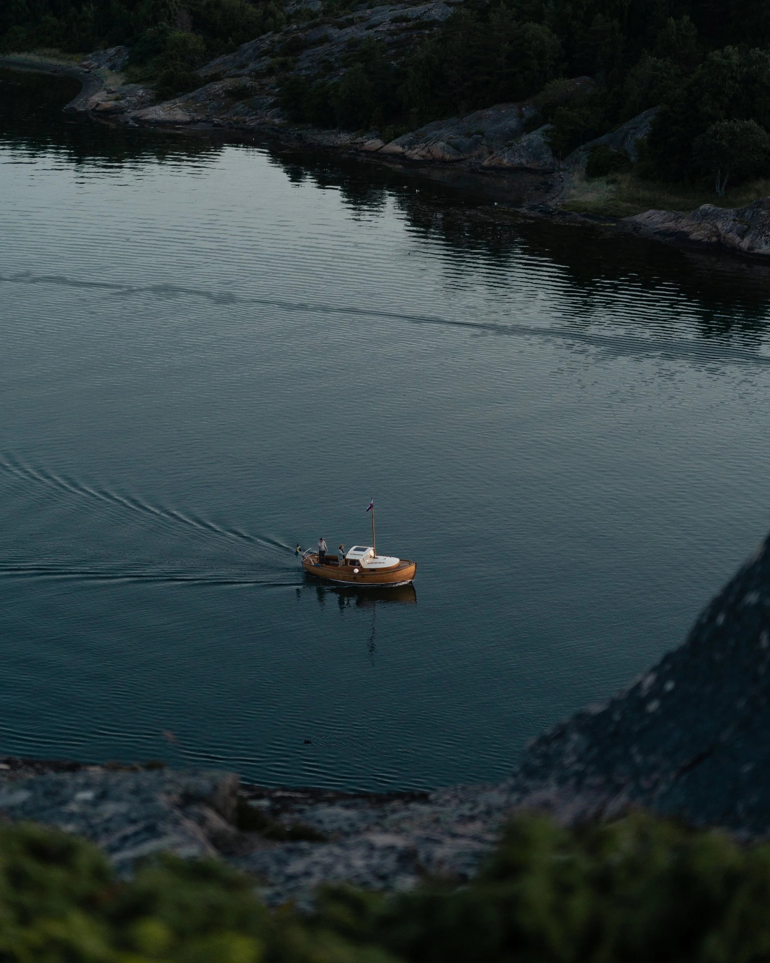 Ein kleines Boot auf einem ruhigen See, umgeben von Felsen und Bäumen.