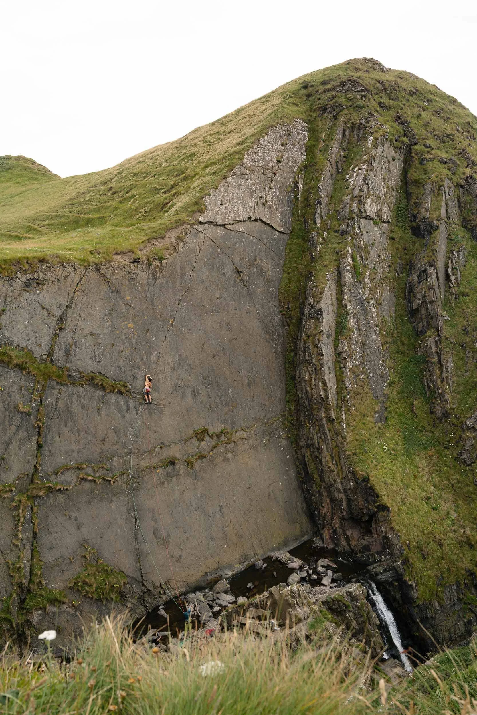 Zwei Frauen beim Wandern in einer Berglandschaft mit steilem, felsigem Hang und grünem Gras. Im Vollbildmodus anzeigen